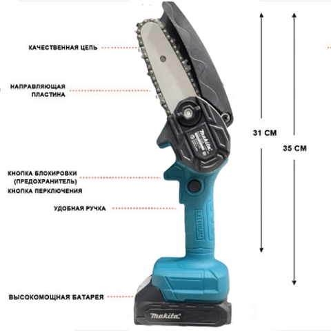 Благодаря отсутствию проводов, аккумуляторная мини-пила Makita обеспечивает свободу передвижения и работает в любом месте без необходимости подключения к электросети.